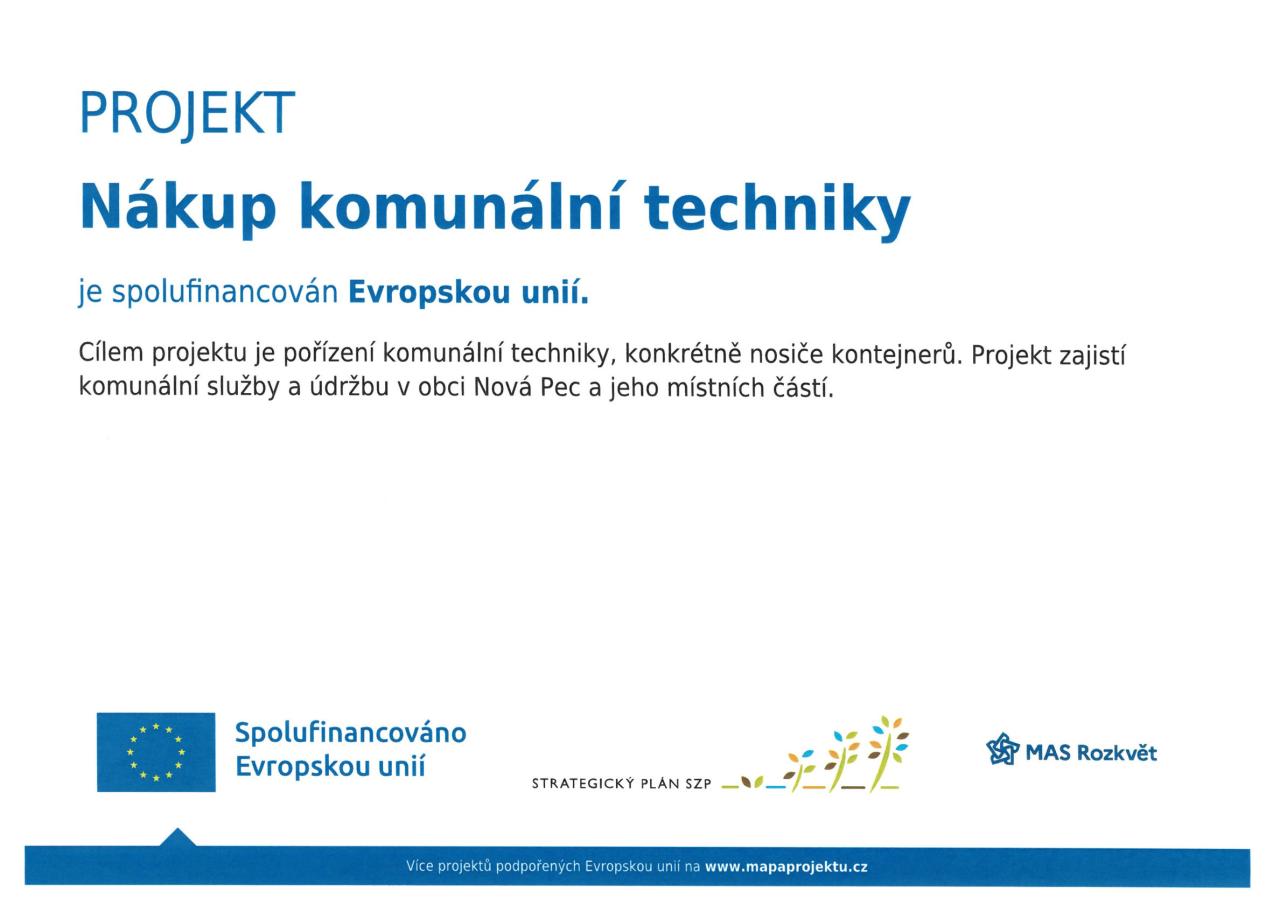 Obec Nová Pec informuje o úspěšné realizaci projektu zaměřeného na pořízení komunální techniky. V rámci tohoto projektu byl pořízen traktorový nosič kontejnerů. Projekt byl realizován za podpory MAS Rozkvět z.s., a to v rámci Strategického plánu Společné zemědělské politiky na období 2023-2027, intervence LEADER.
